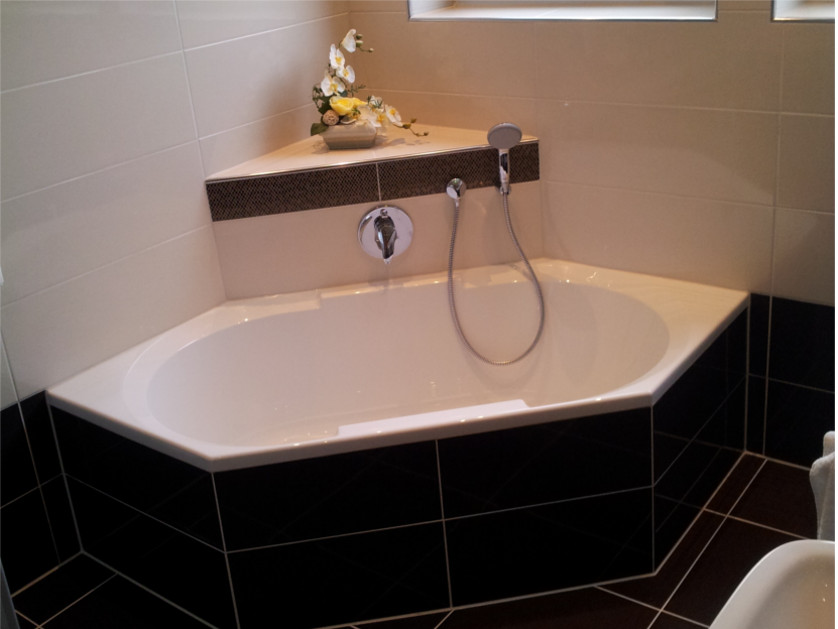 Eckbadewanne Mosaik in einer Nische im Duschbereich Natursteinterasse